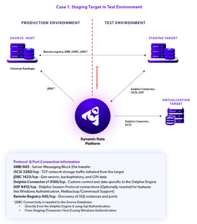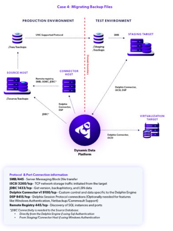 Although this option is not specific to this case, you may notice we separated a connector role to its own connector host. As you can infer from the diagram, the Delphix Connector’s primary function on that host is the discovery of the source environment via remote registry and ODBC calls. Despite the fact that there are no software installation requirements for the source hosts in PRODUCTION, it may be helpful to note that you can even install this role directly on the source server for consolidation if you want to.