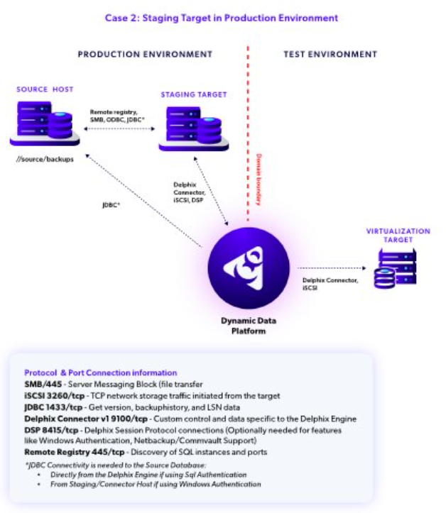 In SQL Server environments, the staging target host is used for staging data from the source database on the source host into Delphix. Although you can use any VDB target host on which the Delphix Connector service has been installed for this purpose, Delphix recommends a dedicated Staging Target Host for load isolation and separation of roles.