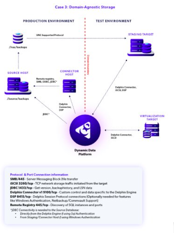 When considering SQL Server deployments in different enterprise environments, we often see cases where the production, development, test, or reporting environments exist in different Windows domains which may or may not have trust relationships. Such varying domain approaches can come into play due to security, organizational, geographical, or other technical reasons, and can make communication between Windows hosts more complicated to manage. Delphix is flexible enough to work in many configurations, but we want to help you choose the solution that best suits your unique environment.