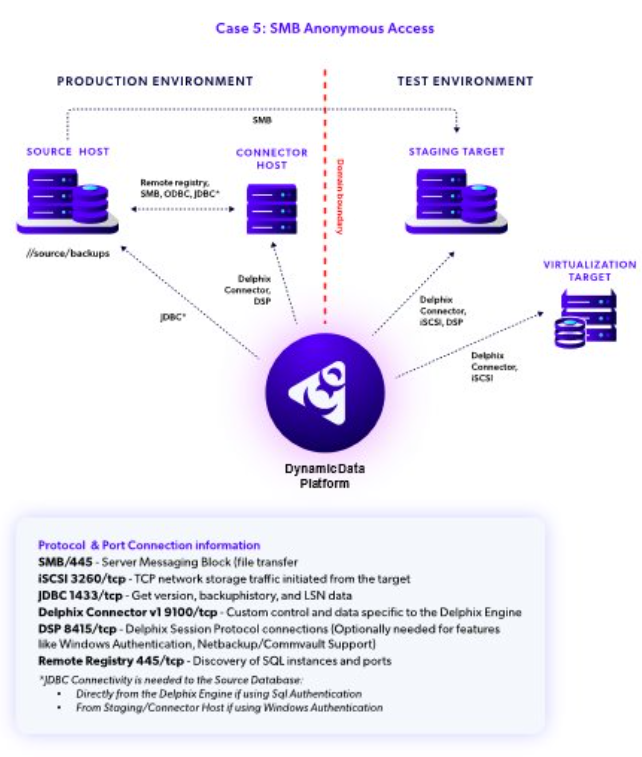This example shows a shared backup location that is not dependent on trust relationships between the PRODUCTION and TEST domains. Because Delphix uses UNC paths, it can support any protocol which provides UNC access for that backup data access – for example, SMB or iSCSI.