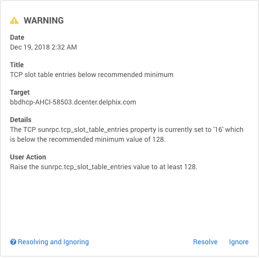 The Details section of the fault explains that the sunrpc.tcp_slot_table_entries property is set to a value that is below the recommended minimum of 128. The User action section instructs you to adjust the value of the sunrpc.tcp_slot_table_entries property upward to the recommended minimum. The process for adjusting this property differs between operating systems. To resolve the underlying issue, search "how to adjust sunrpc.tcp_slot_table_entries" using a search engine and find that the second result is a link to the Delphix community forum describing how to resolve this issue. After following the instructions applicable to your operating system, return to the Delphix UI and mark the fault resolved.