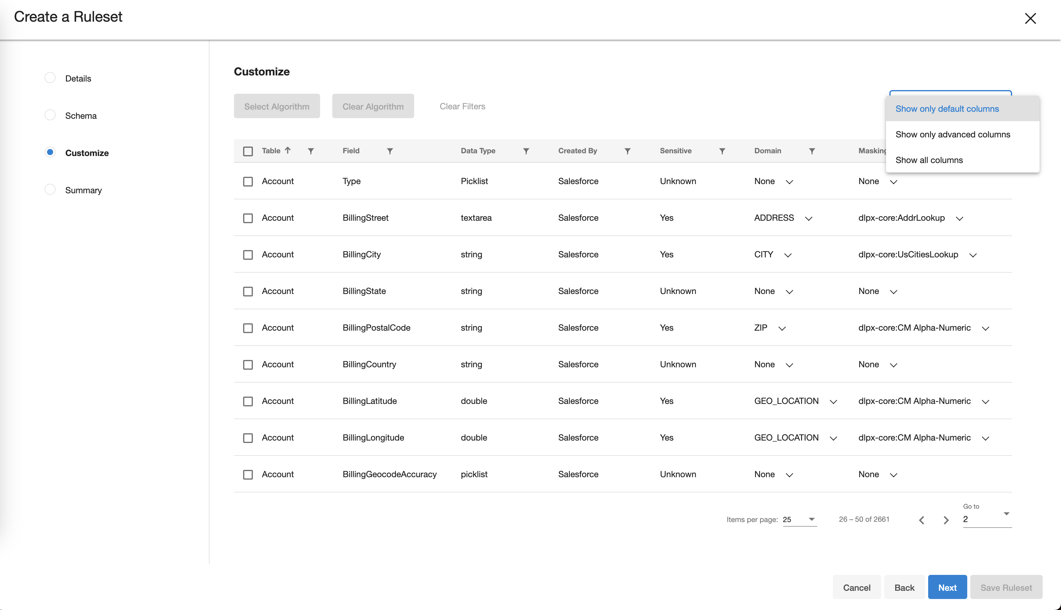 The “show only advanced columns” option shows columns that Delphix expects cannot have masking algorithms applied to them; this includes fields that are not updateable, as well as fields that have a type of Address, Auto Number, Formula, Geolocation, Hierarchy, Lookup, and Roll-Up Summary as those are not directly maskable.