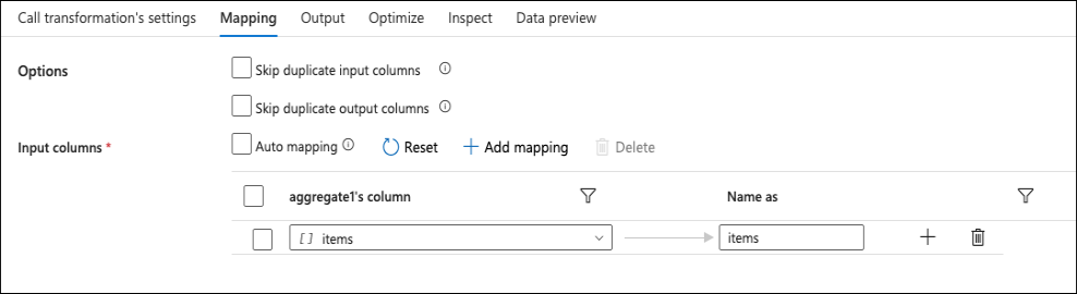Set the Unroll by to body.items in the Flatten settings, then for the Input columns, add all the body.item columns that are coming back from the external call. These will be all the masked values with the surrogate key. It may be easier to click the reset button and delete unneeded columns.