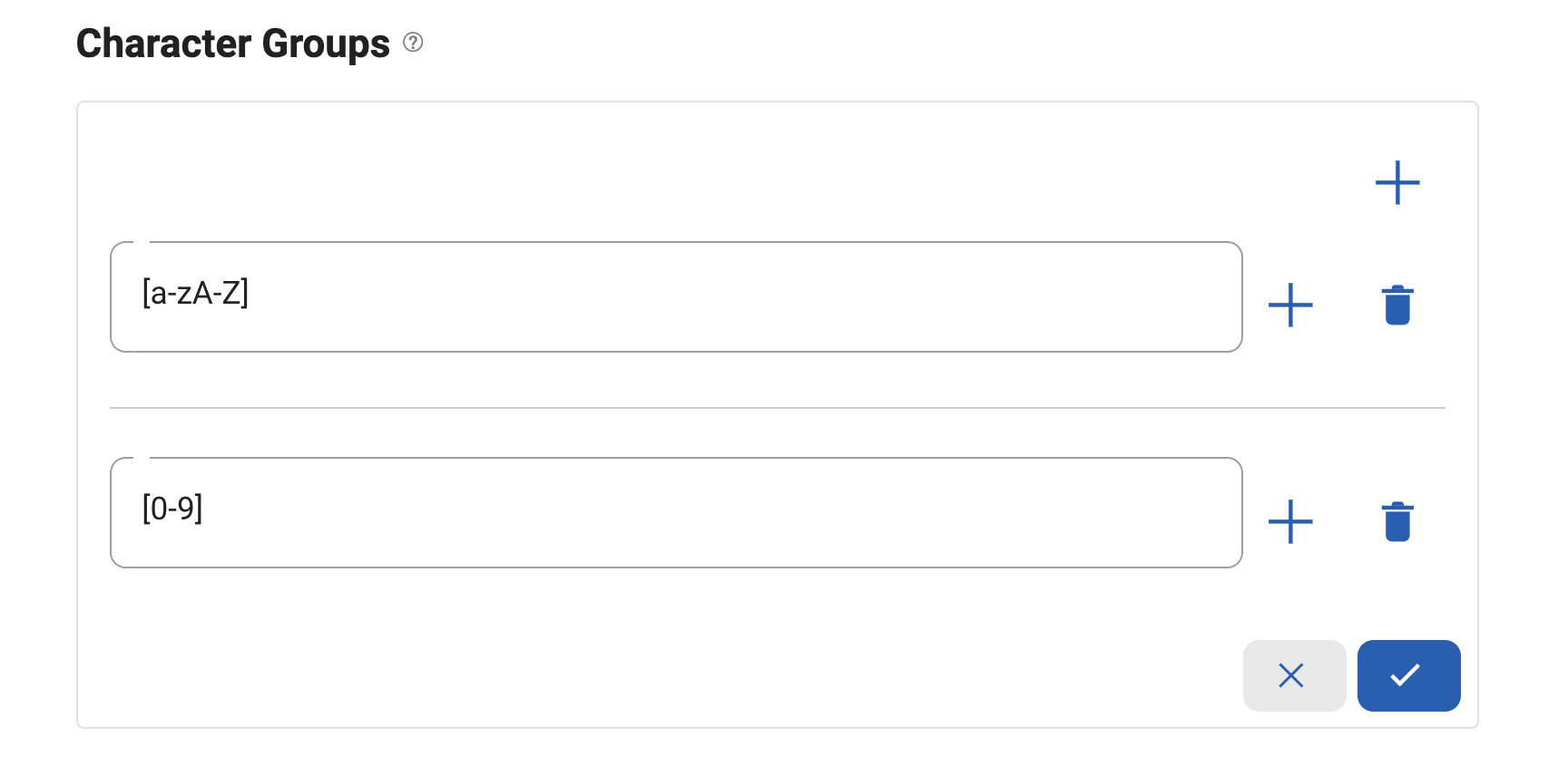 Each group may defined either by specifying each literal character in the group, such as "0123456789", or using Java Regular Expression style character ranges, such as "[0-9]". The algorithm will freely map characters to other characters within the same group, so by defining groups "[0-9]" and "[A-Z]", numbers would be replaced by other numbers, and letters by other letters, but a number would never be replaced by a letter. Groups should not contain duplicate characters, and each character may belong to only one group. Any character that is not assigned to a group will be preserved (not masked) by the algorithm. The box below the entry area allows selection of character groups defined for other, preexisting Character Mapping algorithms. -