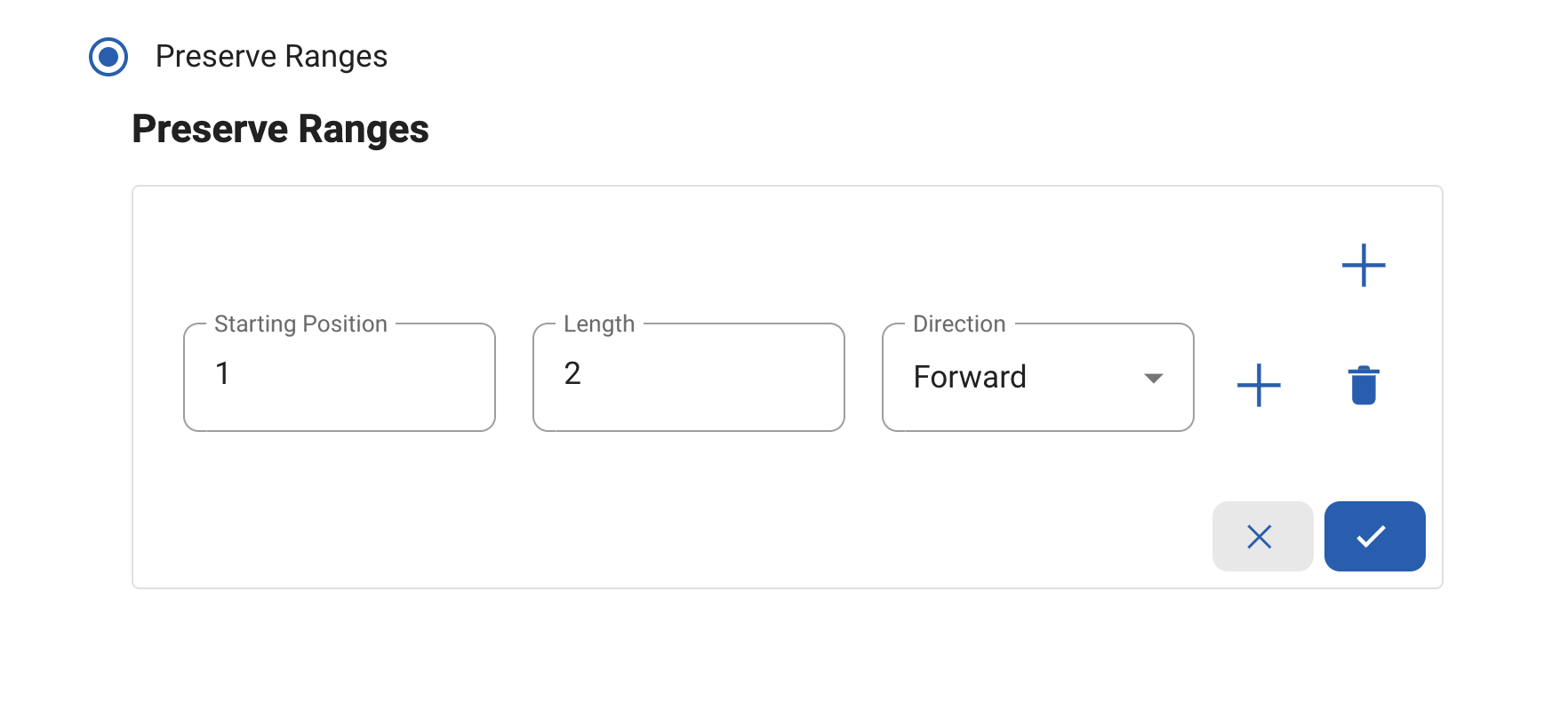 For Character Mapping algorithms, only characters that would otherwise be masked count when determining position for preserve ranges. Each preserve range is defined by: -