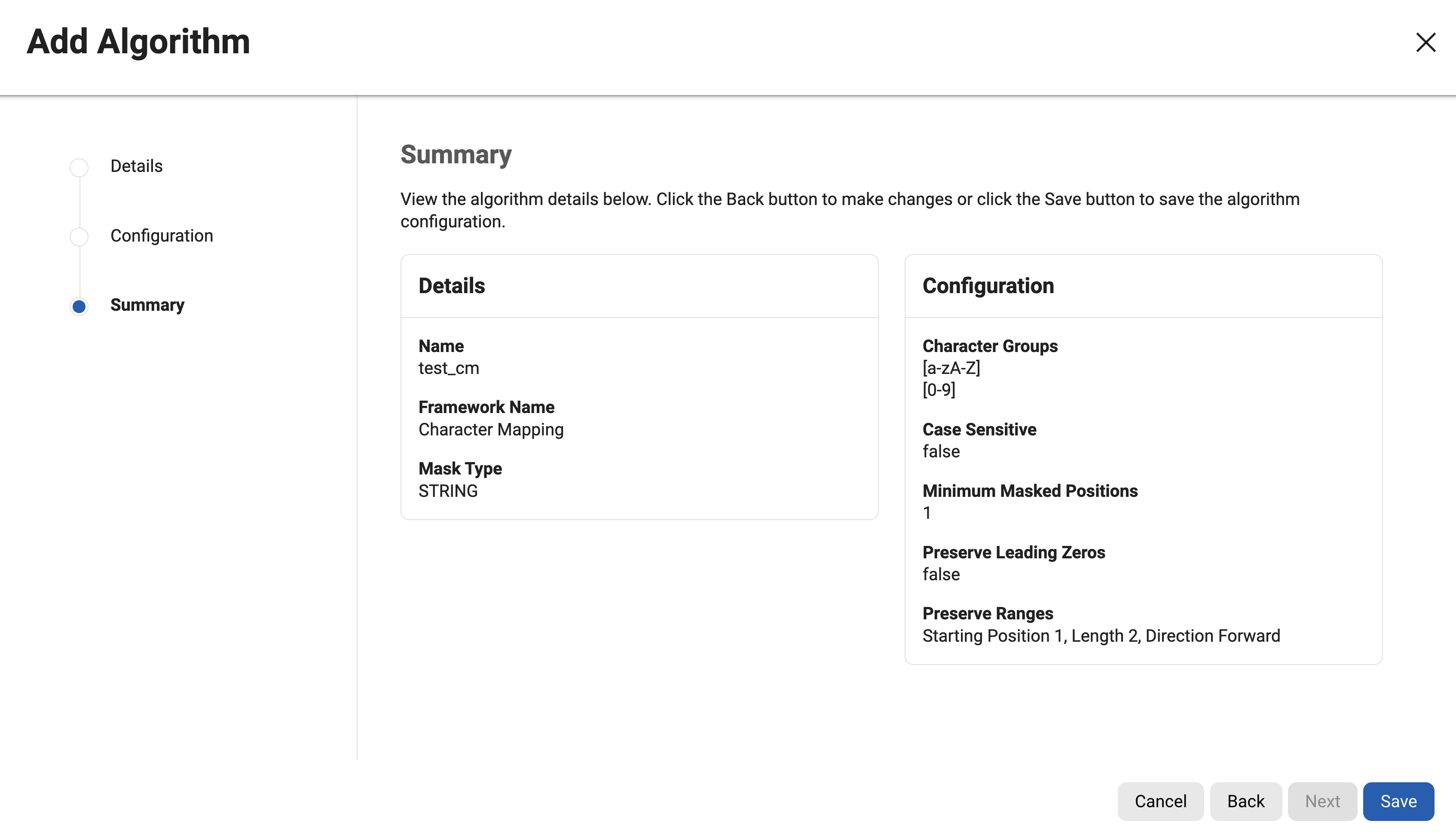 Select a value for Minimum Masked Position, which sets the minimum number of characters that the algorithm must mask; fewer positions triggers non-conformant data handling. Null, empty, and all-whitespace values never trigger non-conformant data handling.