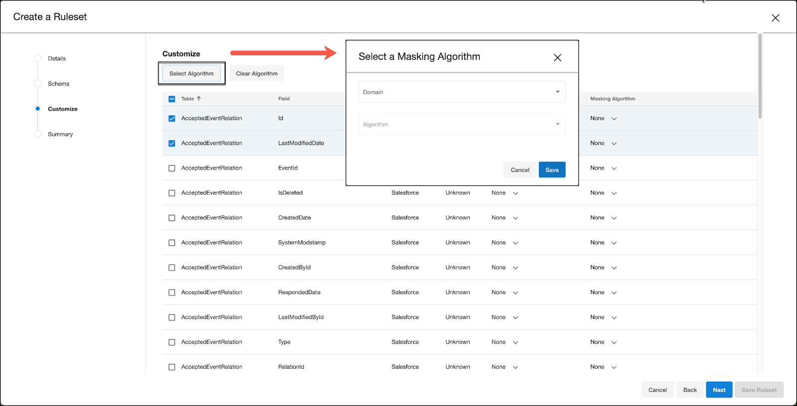 The “show all columns” option shows all columns.Use the Data Type information present in the Ruleset to help identify which domains and algorithms may be applicable to the underlying data.