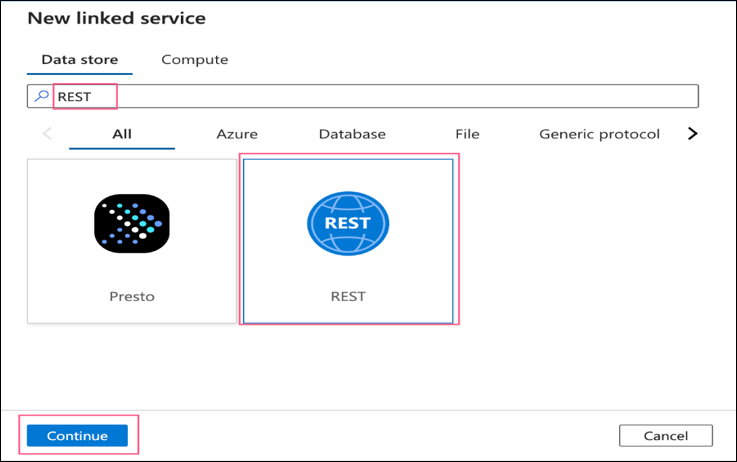Search for REST in the search bar and select the REST linked services highlighted in the below snapshot and then click on Continue.