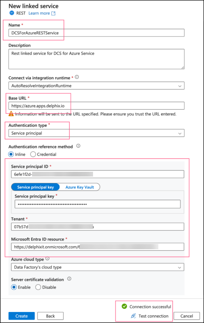 Service principal ID, Service principal key, Tenant, and Microsoft Entra ID resources should be relative to what was set up during the Registering a Service Principal process.