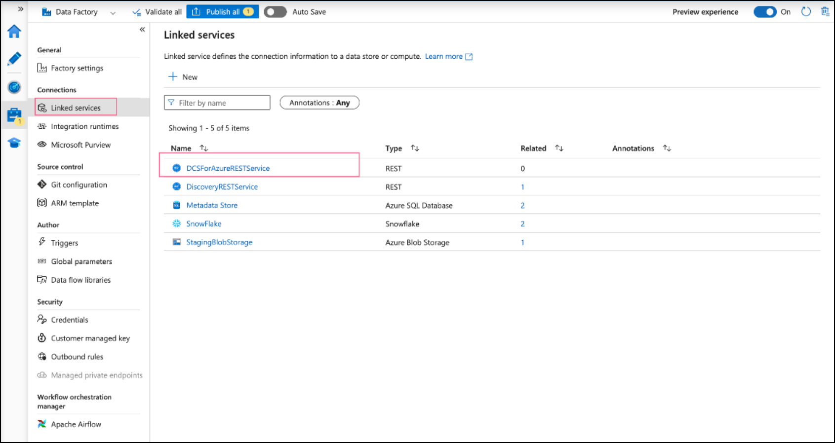 Click on the Create button to create the REST linked service. Once it is created, this will show up in the list of Linked services.