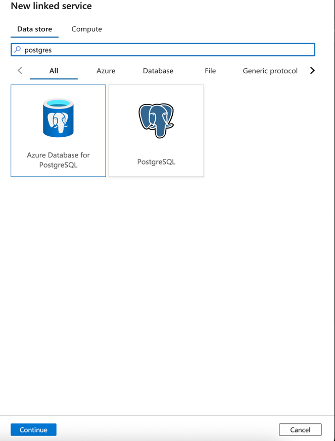 Select Azure Database for PostgreSQL from the list, then Continue.