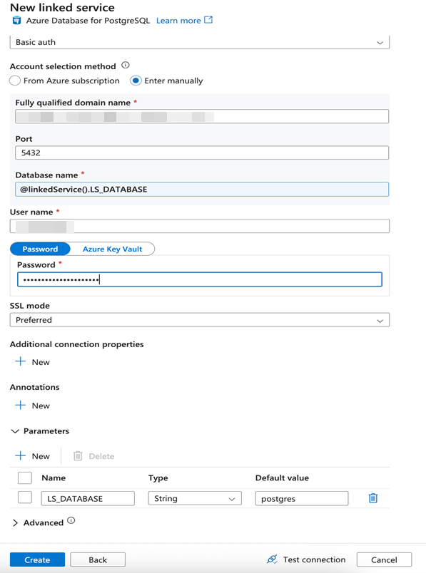 Your parameterized PostgreSQL Database linked service is now configured and ready to use in Azure Data Factory.
