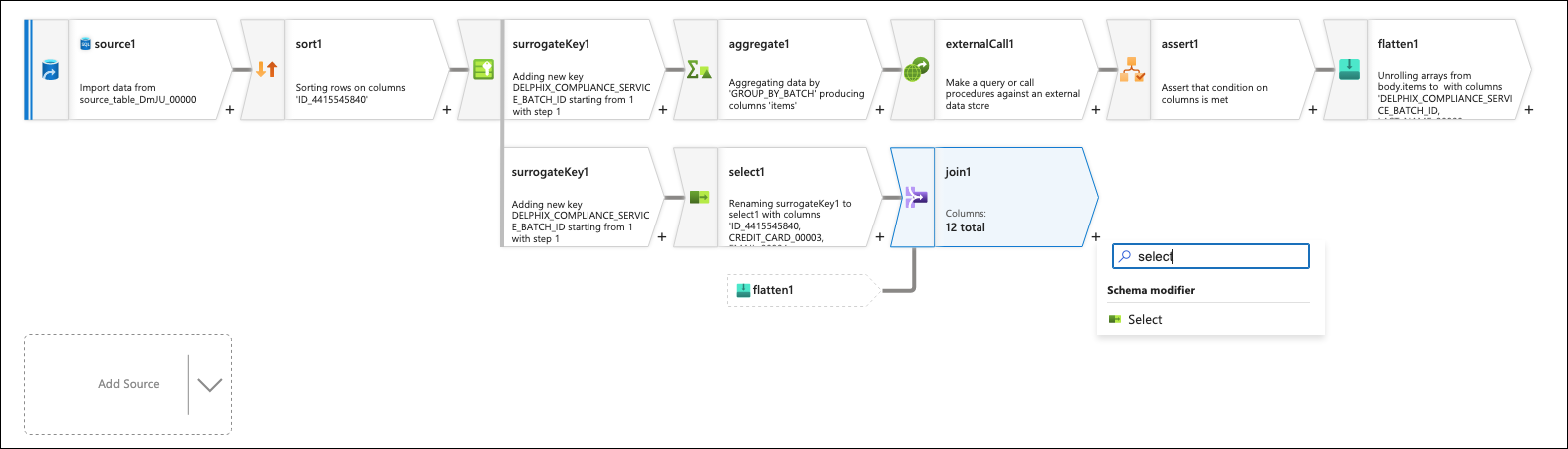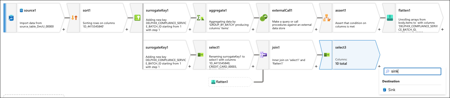 In the Select settings, delete the two columns that were joined with the names <flow step>@DELPHIX_COMPLIANCE_SERVICE_BATCH_ID. This is not always needed, but depends if the write out to the sink has issues with extra columns. For easier debugging, the order of the columns can also be modified to match the original source’s column ordering.
