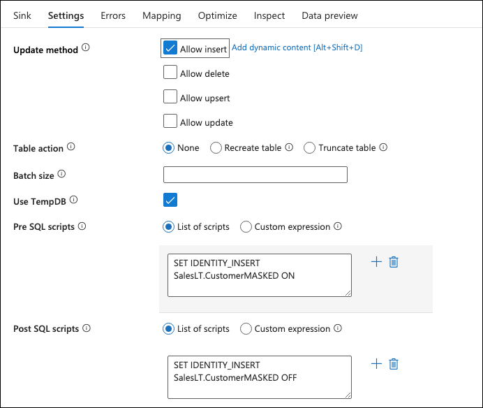 On the Sink tab, set the dataset to be the sink dataset that was previously added.