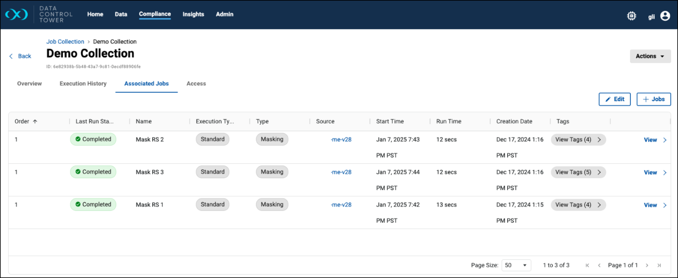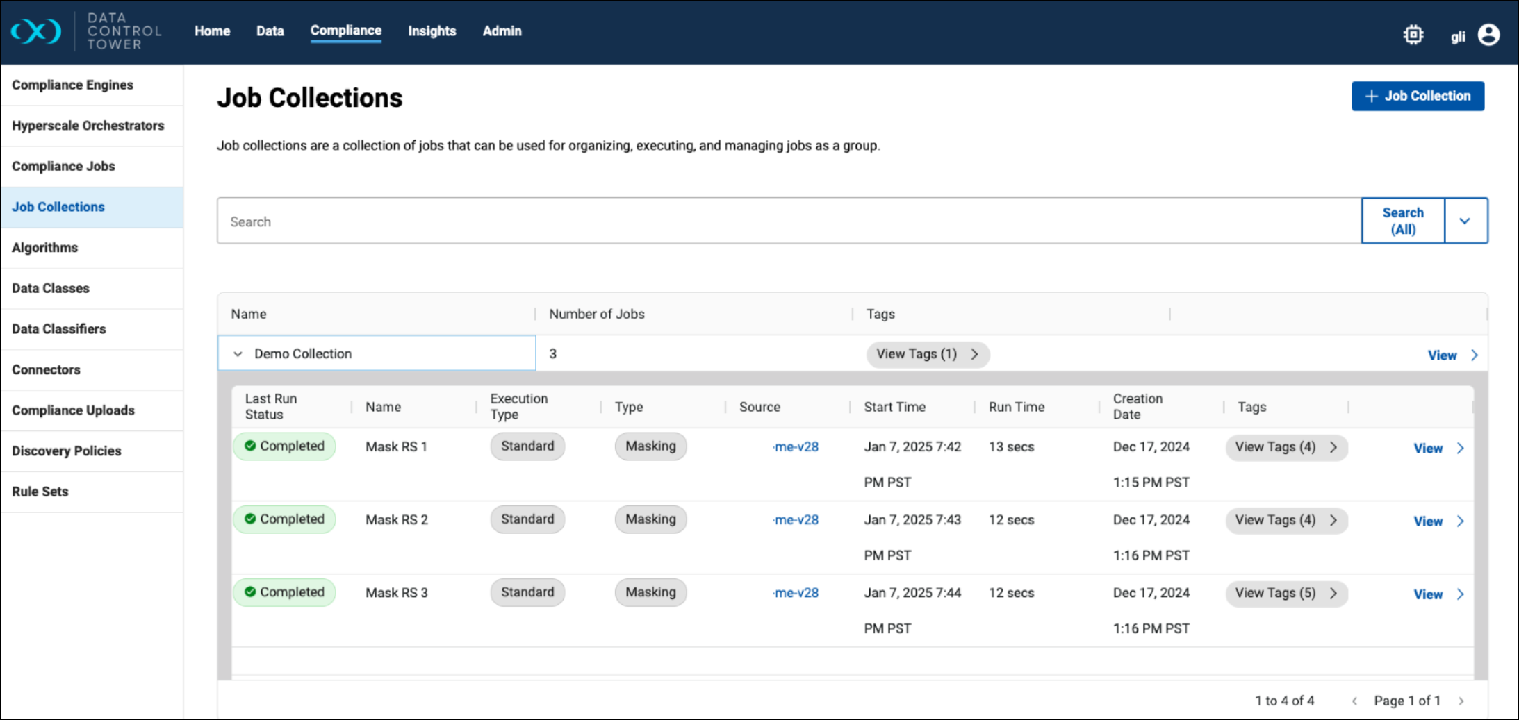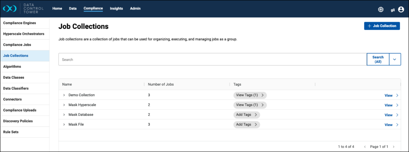 Standard compliance jobs and Hyperscale compliance jobs are supported in a Job Collection. While the feature is designed around standard compliance jobs (since a compliance job entity in DCT encapsulates all masking, profiling, tokenization, and re-identification jobs on the engine), they can both be included in a Job Collection. A UI is available to create, read, update, and delete a Job Collection, as well as manually executing or cancelling one. In addition, a Job Collection can be automatically executed per VDB refresh on a Continuous Data engine. This feature aims to address a pain point of using hook scripts to execute multiple compliance jobs per VDB refresh.