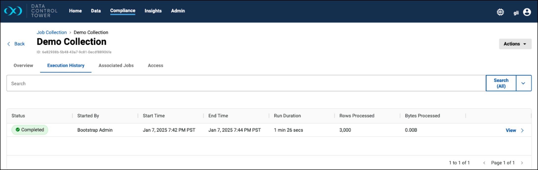 Each row in the Job Collections lists the member compliance jobs, with an expansion arrow left of name of the job. Clicking on the View button on a row takes you to the details page of a Job Collection.