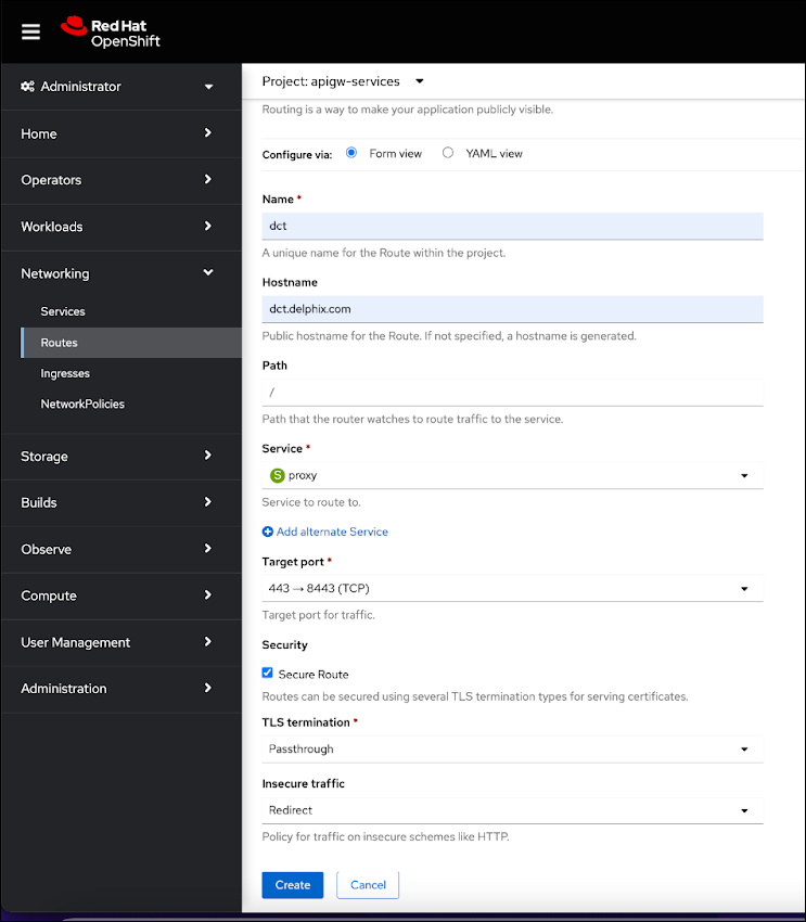 To create a route, you can use the OpenShift console and create a new one for the DCT service.