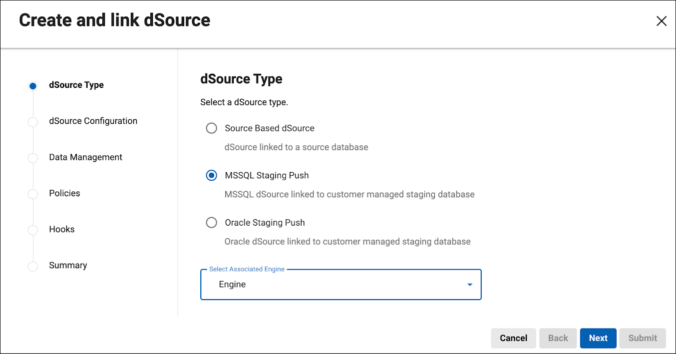 Following the selection of the dSource type, users must then choose the associated engine from the dropdown menu, which lists the available engines that have been registered in the DCT environment. This setup dictates the subsequent configuration steps to ensure the linked dSource is correctly aligned with the user's infrastructure and database management strategy.