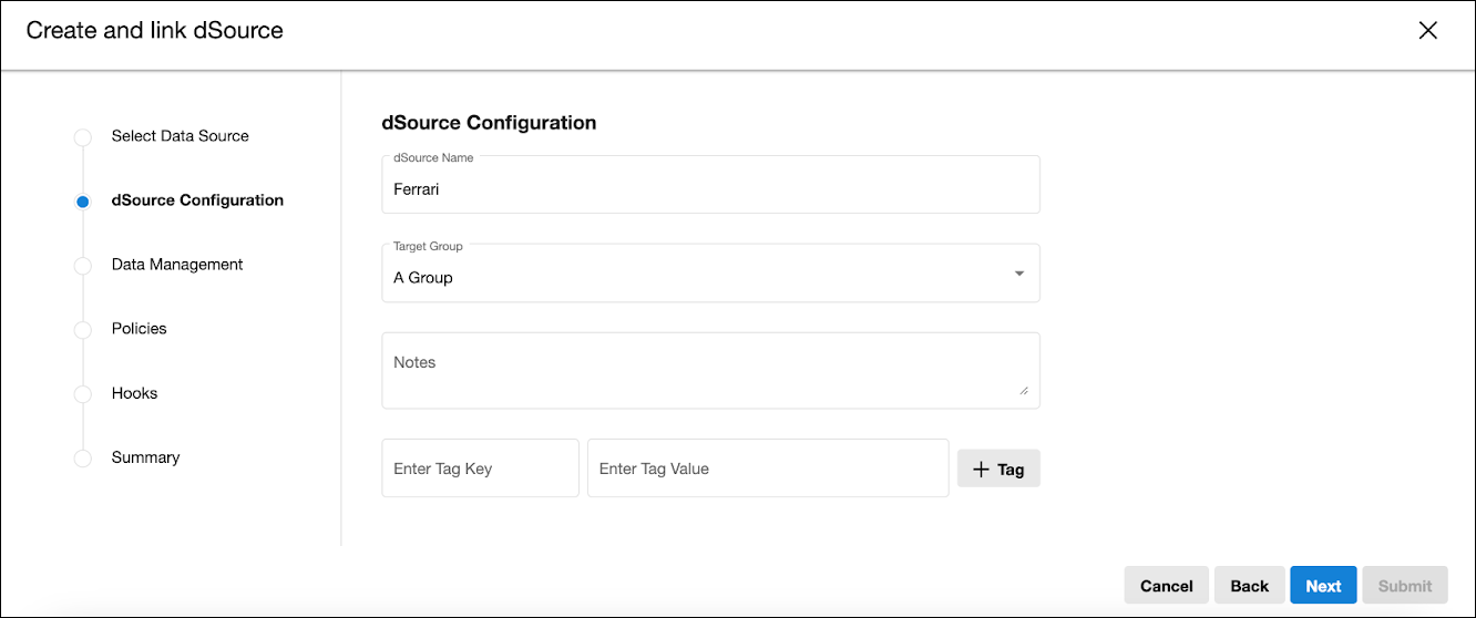 Name your dSource here. By default, the dSource name mirrors the name of the source, but it can be modified. Choose the Target Group within the engine to which the new dSource will be added. Add Notes, and a Tag Key and Tag Value pair, if needed. You must also configure any necessary settings required, based on the source.