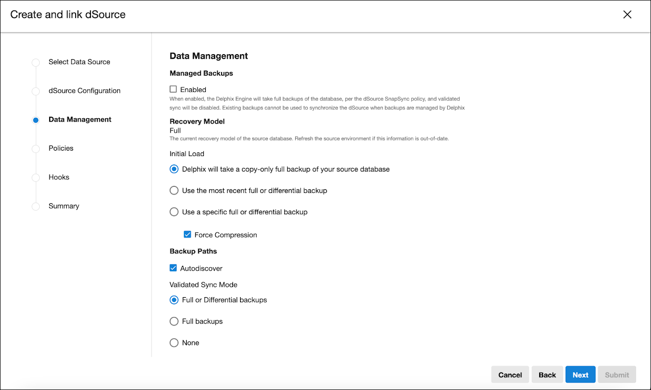 The step contains various dSource configurations for optimal data management. The wizard fetches and pre-populates the default values for various data fields, saving you time and reducing manual entry errors.