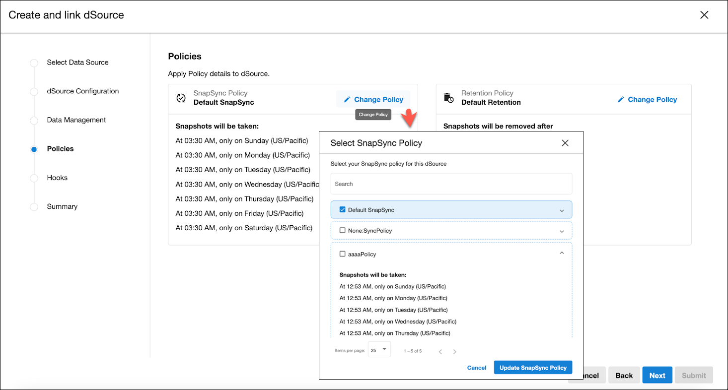 Tailor the SnapSync and Retention policies according to your requirements. Default policies are selected initially, but these settings can be modified through the Select Policy dialog.