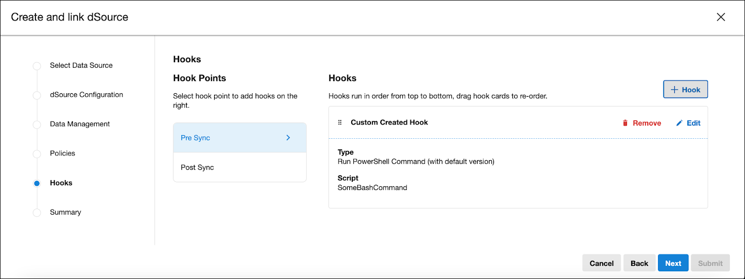 Enhance the dSource with custom created Hooks. Use the + Hook button to define the scripts that will execute at various stages of the process, offering greater control and customization over the dSource creation workflow.