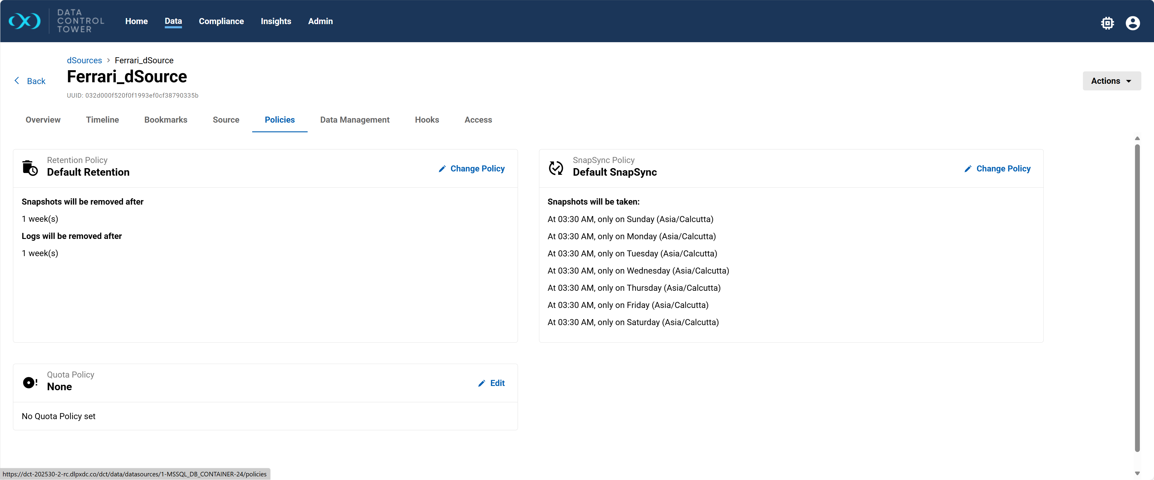 Retention Policy: Shows the current Retention policy on the dSource, along with a time frame of when the associated snapshots and logs will be removed (based on the policy).