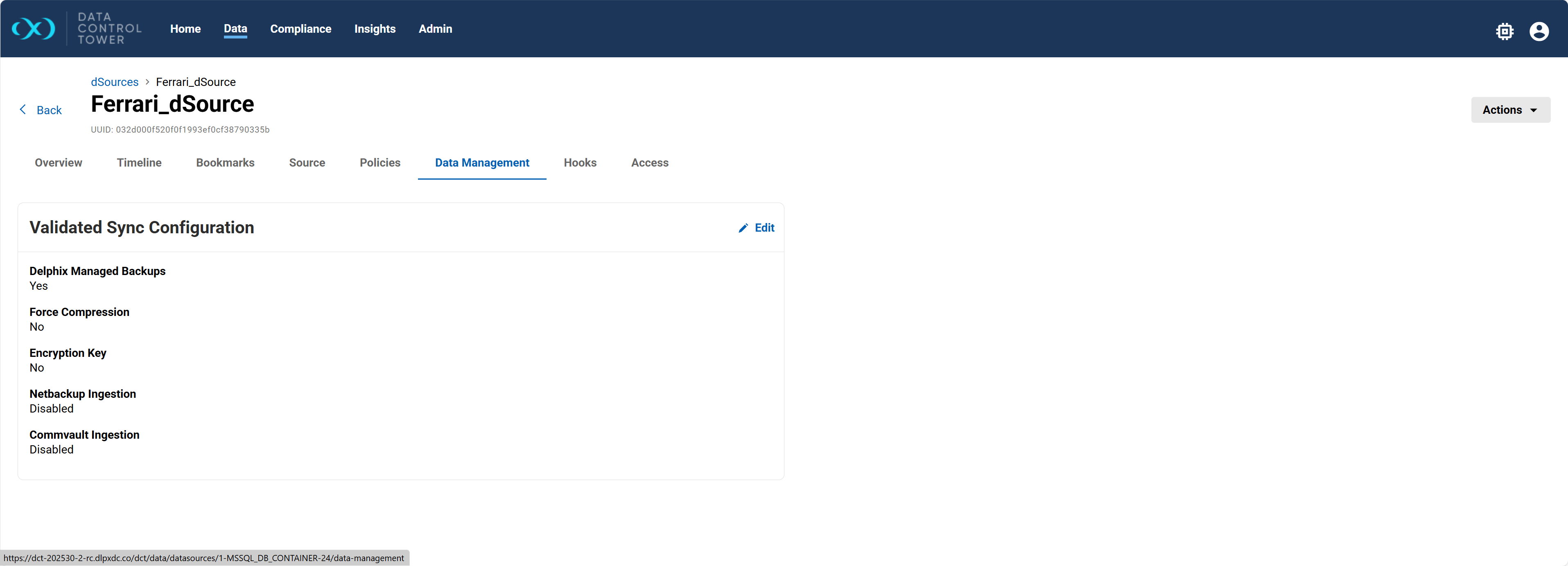 The Data Management tab summarizes key settings and ingestion configurations associated with the dSource, along with the following details.