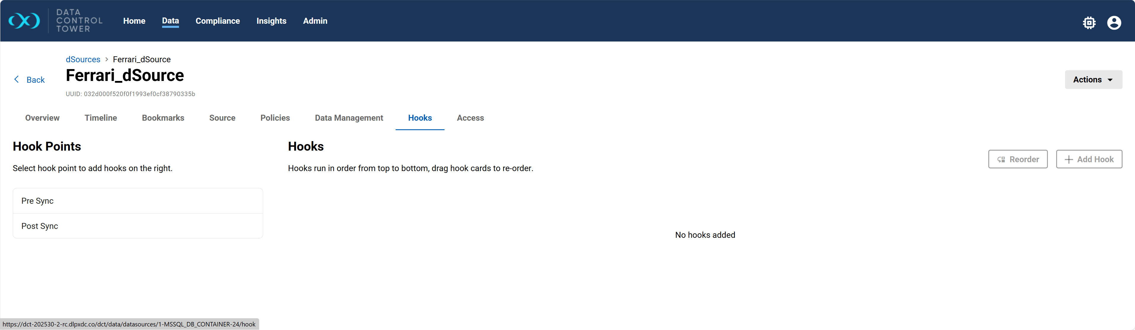 The Hooks tab lets you configure and manage automation scripts that run at specific points during the dSource sync process. The Hook Points tile is used to show scripts or actions executed before or after the dSource sync. You can use the + Add Hook button to add script as a hook, then use the Reorder button to arrange the execution order of hooks.