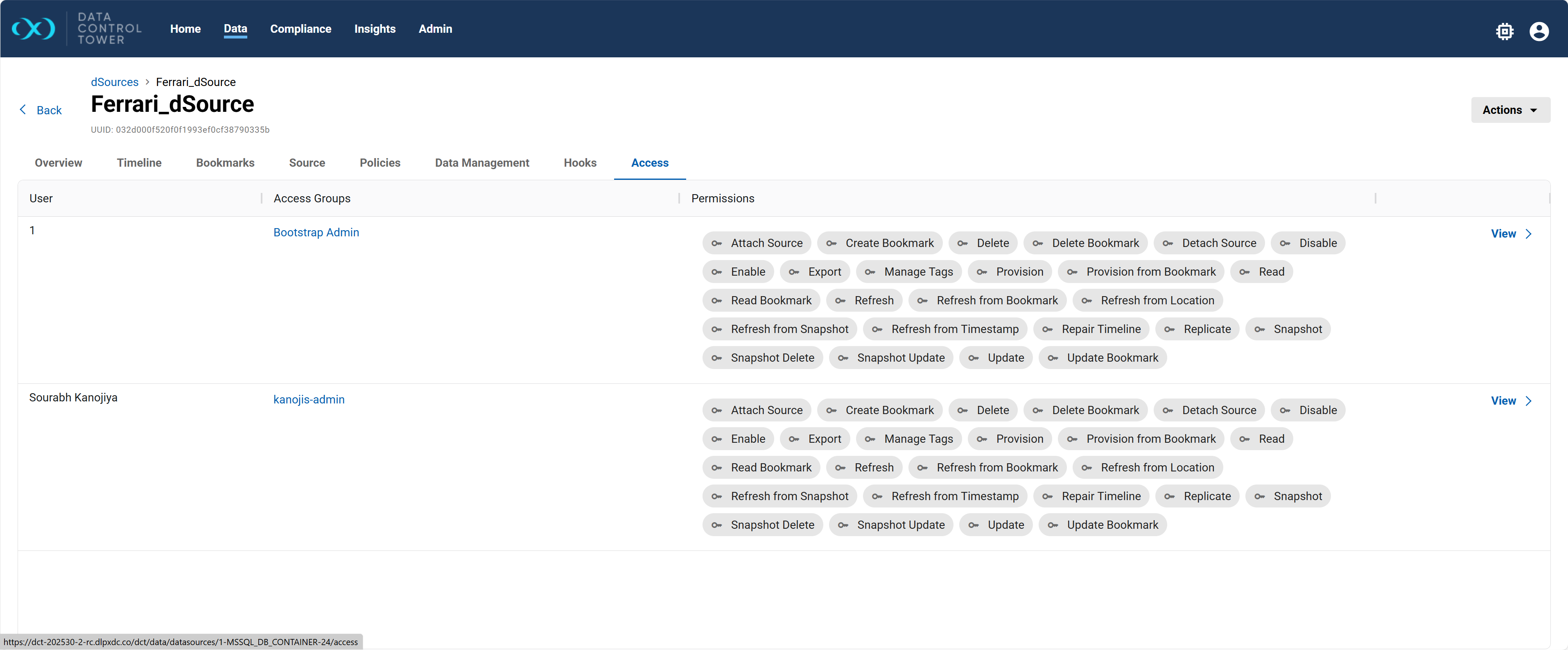 The Access tab lets you audit what other users have access to a particular dSource, what access group they belong to, and the associated permissions that each user has on that particular dSource.