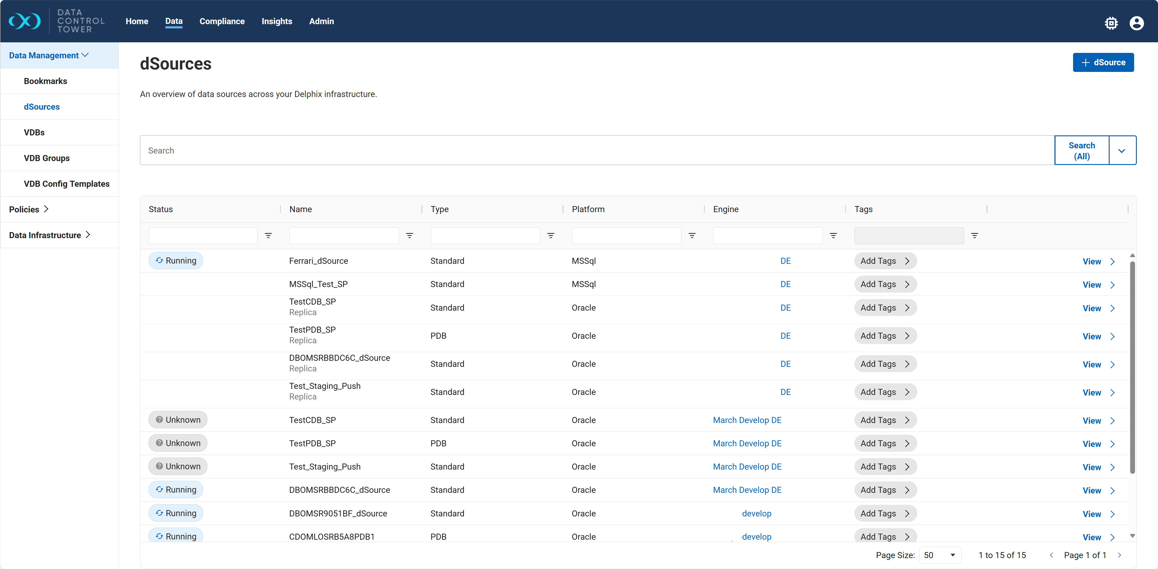 DCT provides the ability to view, search, sort, and filter all dSources within a connected Delphix ecosystem. You can access the dSources list in DCT by navigating to Data > Data Management > dSources. The default view of this page will show all listed dSources in DCT, along with some useful column information like status, type, platform, engine, and tags. Click the View button for any line item to see the dSource detail page.