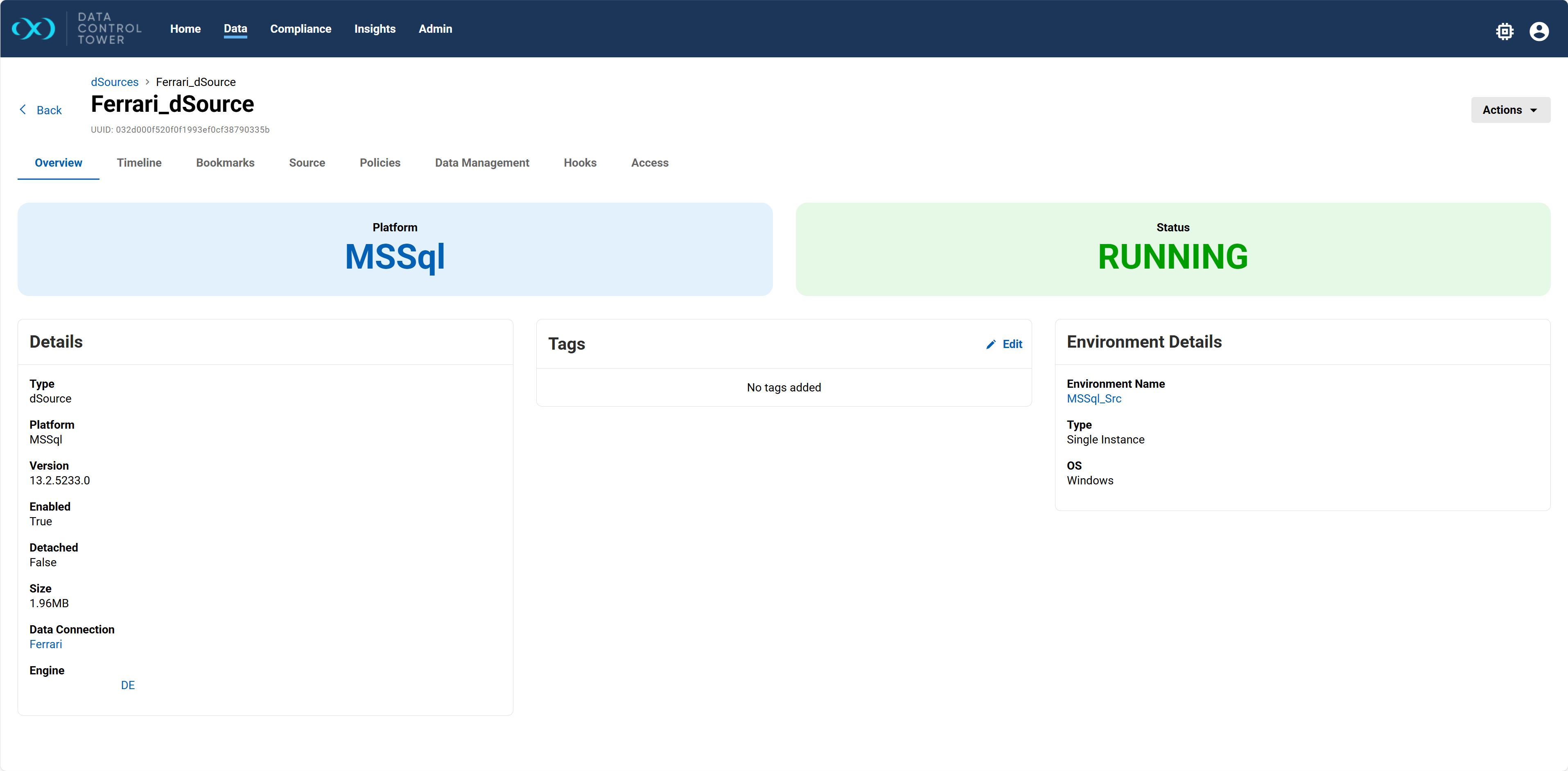 The default tab of any detail page in DCT is the Overview tab. This page shows which Platform the dSource is from and what the Status of it is, along with the following tiles.