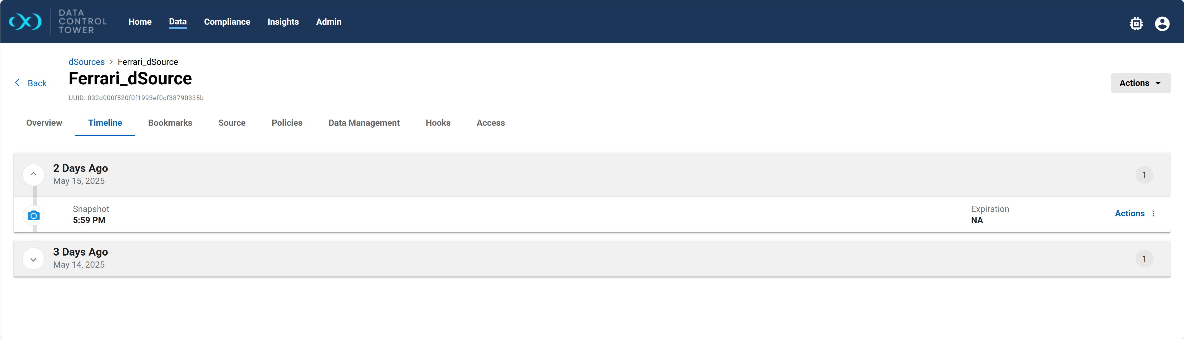 The Timeline tab lists all available snapshots for the dSource in a vertical, chronological order. You can modify snapshot retention periods by clicking the Actions button to the right of the relevant snapshot.