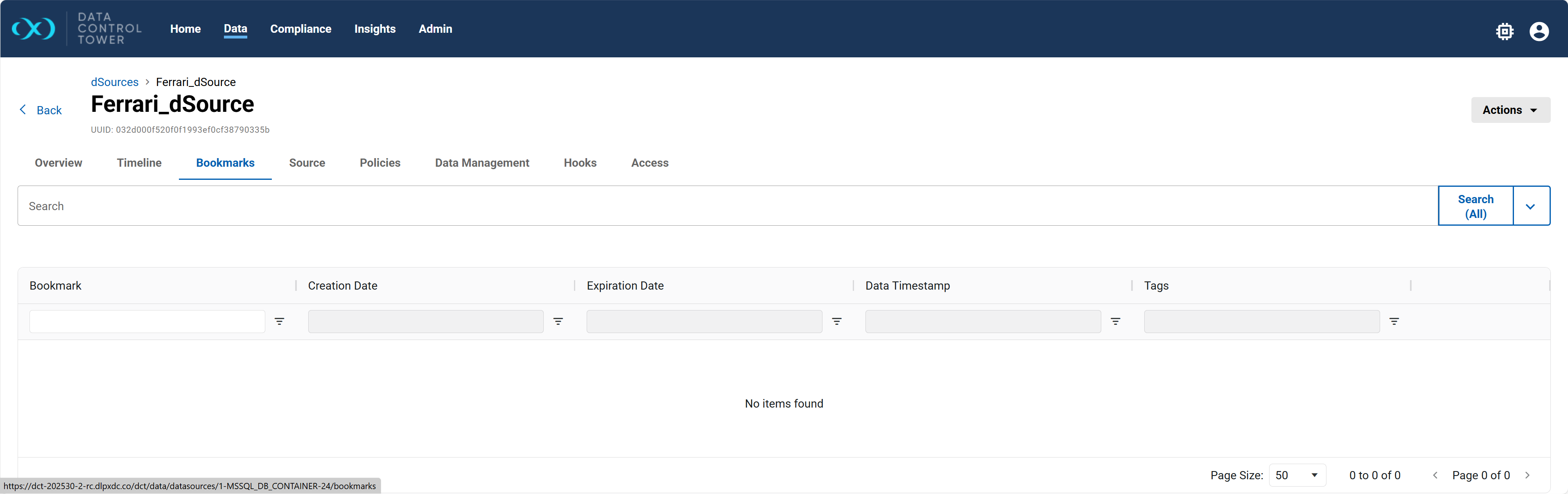 A bookmark in Data Control Tower (DCT) is a saved reference to a specific snapshot of a dSource. It allows you to quickly return to or reuse a known data state. The Bookmarks tab lists any bookmarks from the dSource, along with information like its name, creation date, expiration date, the timestamp of when it was saved, and any relevant tags.