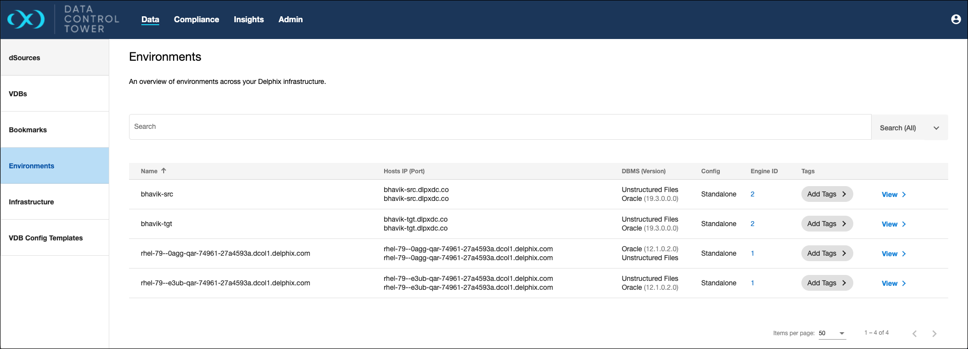 DCT provides the ability to view, search, sort, and filter all Continuous Data environments within a connected Delphix ecosystem. This page can be found under the Data section and is used to find and act upon all environment connections.