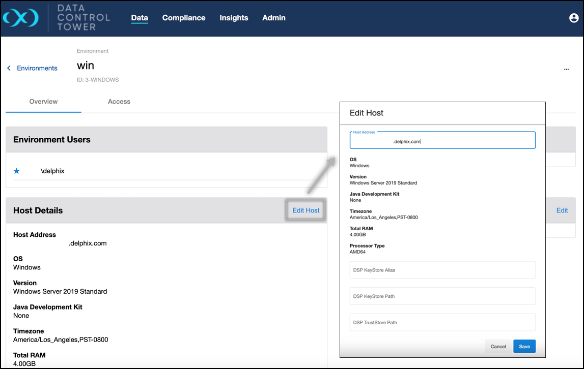 Selecting a standalone environment in the Data page shows an Edit Host option; it is not yet available for cluster environments. When the button is selected, the host details window will open, showing the input fields that can be edited. Select 'Save' to confirm the changes and close the window.