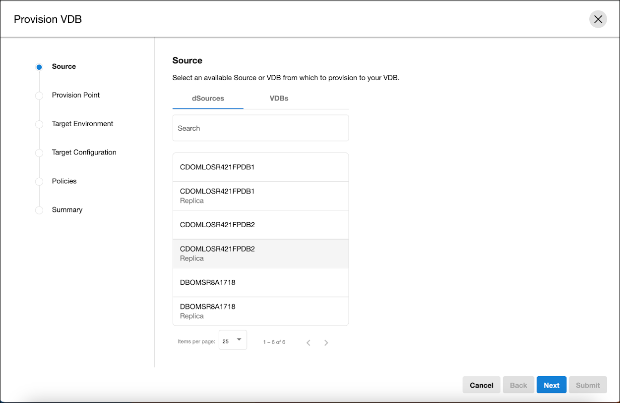 On the VDB provisioning wizard, replicated objects(VDB/dSources) are marked as replicated.