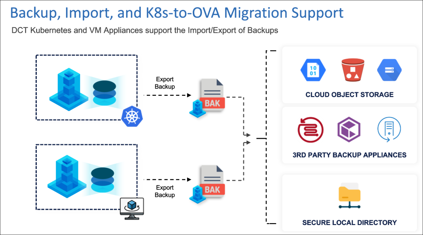 The latest release of DCT supports the ability to perform a complete backup and recovery for the OVA installation. Delphix recommends saving your backups regularly to maintain good disaster recovery practices. In addition, because existing K8s backup and migration support, administrators can now migrate from K8s to the OVA installation. Schedule time with your Delphix Account Team and your organization’s Cloud Platform team to ensure a seamless migration. -