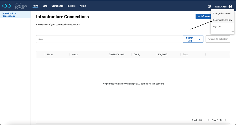 Non-admin user accounts now have support for regenerating the API key in DCT version 23.0.0. This can be accessed after clicking your account name in the top-right corner of the application.