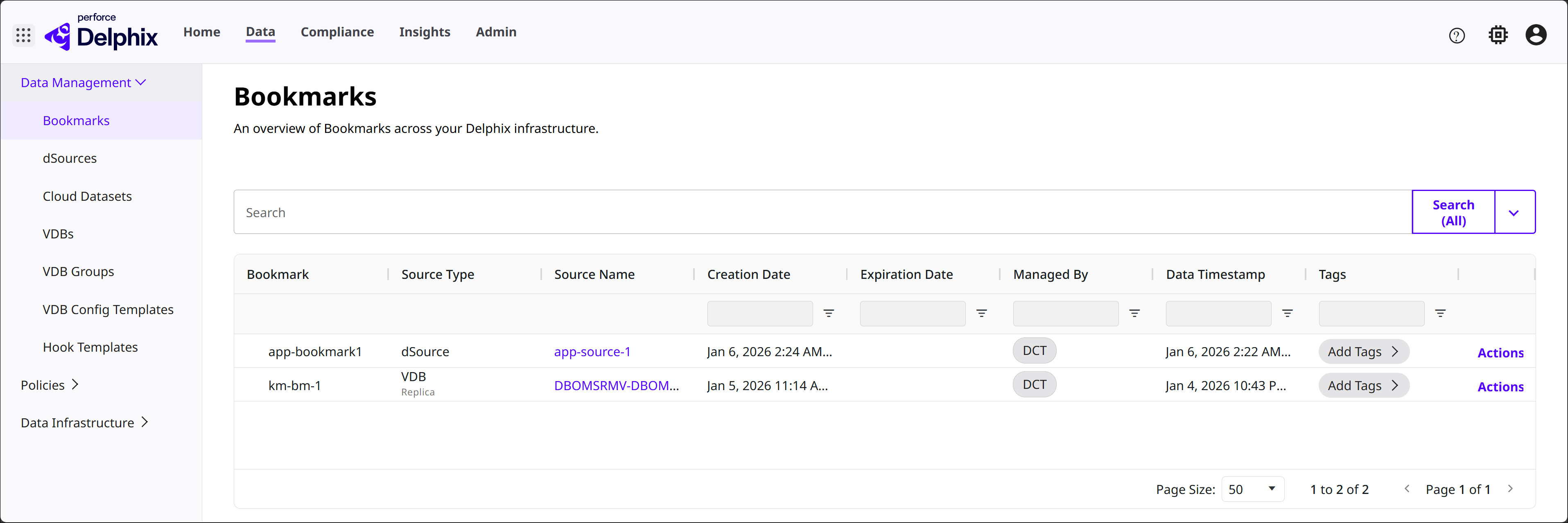 Bookmarks are a nameable time reference of a VDB or VDB group snapshot. DCT provides a near real-time list of all bookmarks across all VDBs and VDB-groups and their associated VDB(s) from the Data > Data Management > Bookmarks section of the UI.