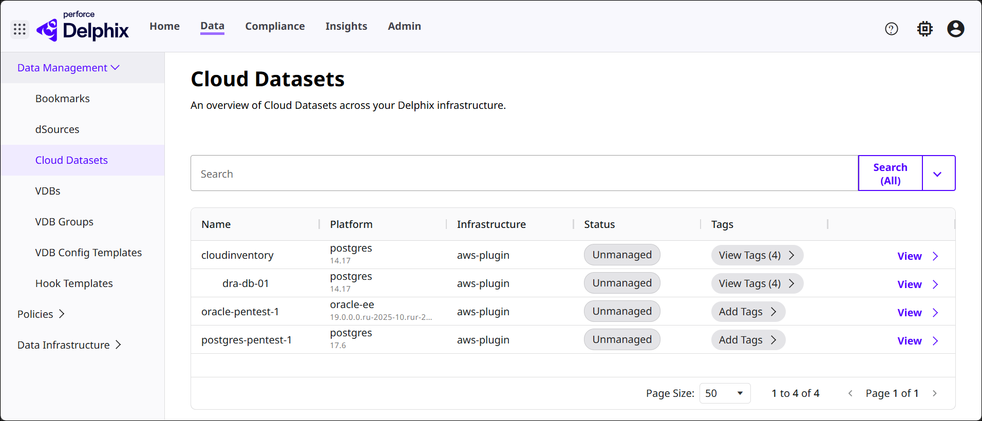 The Cloud Datasets section provides a centralized list of all datasets sourced from cloud‑based infrastructure and connected through Delphix plugins (such as AWS, Azure, or other cloud integrations), with columns of information for Name, Platform, Infrastructure, Status, and Tags. This helps administrators understand which datasets originate from cloud environments, monitor their lifecycle status, and manage associated metadata such as tags and platform information.