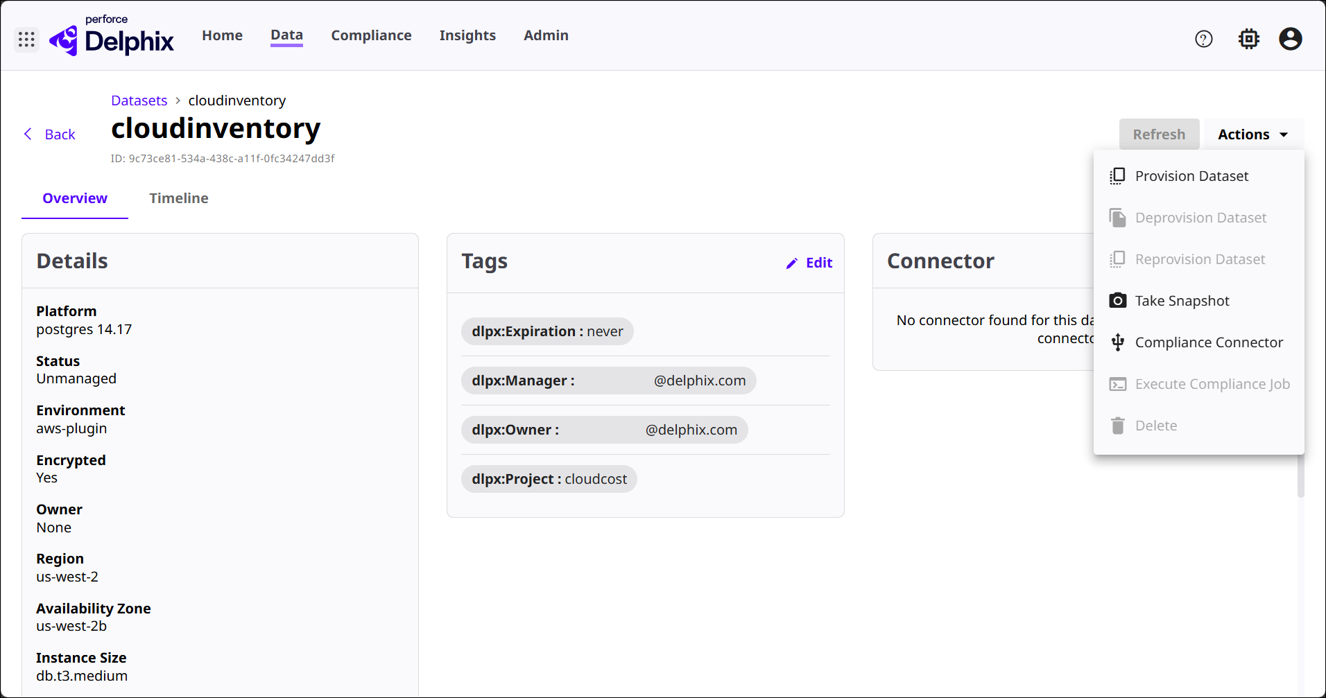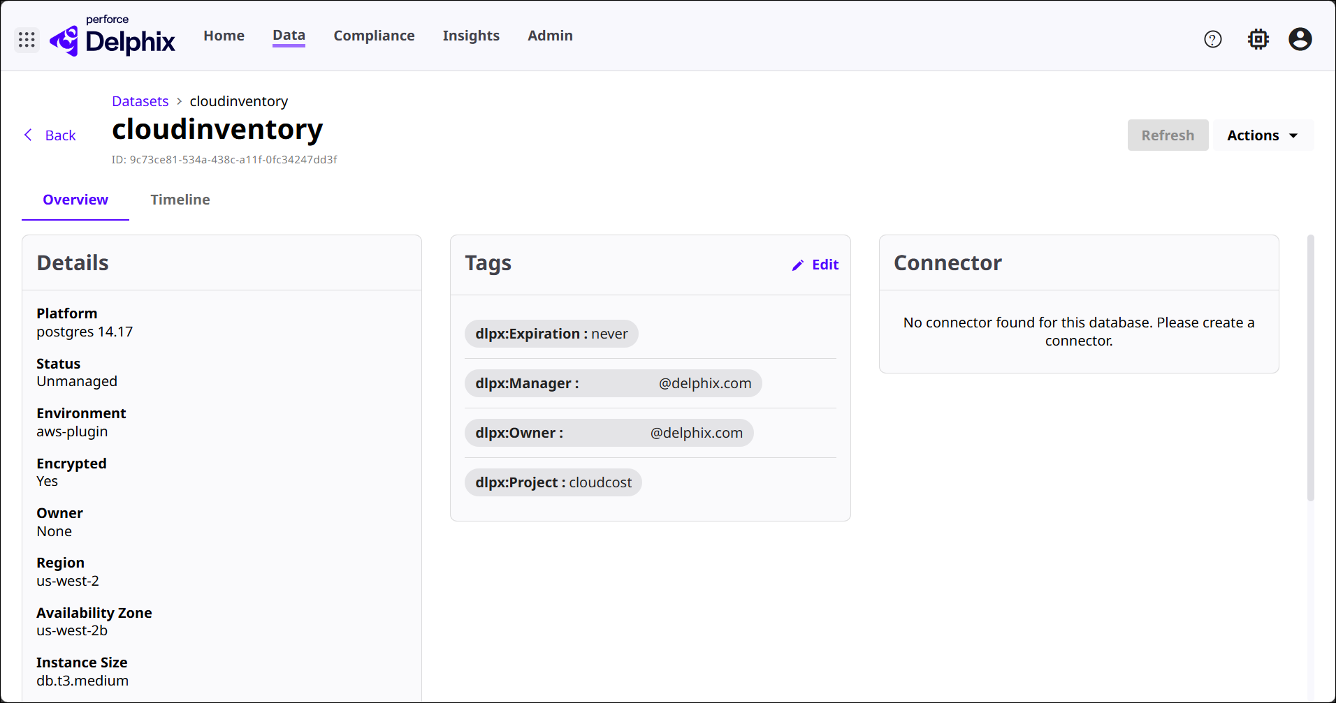 Connector: Shows the connector status for this dataset. If no connector is configured, DCT informs you and prompts to create one. For cloud datasets, connectors typically enable ongoing ingestion, syncing, or communication between Delphix and cloud infrastructure.