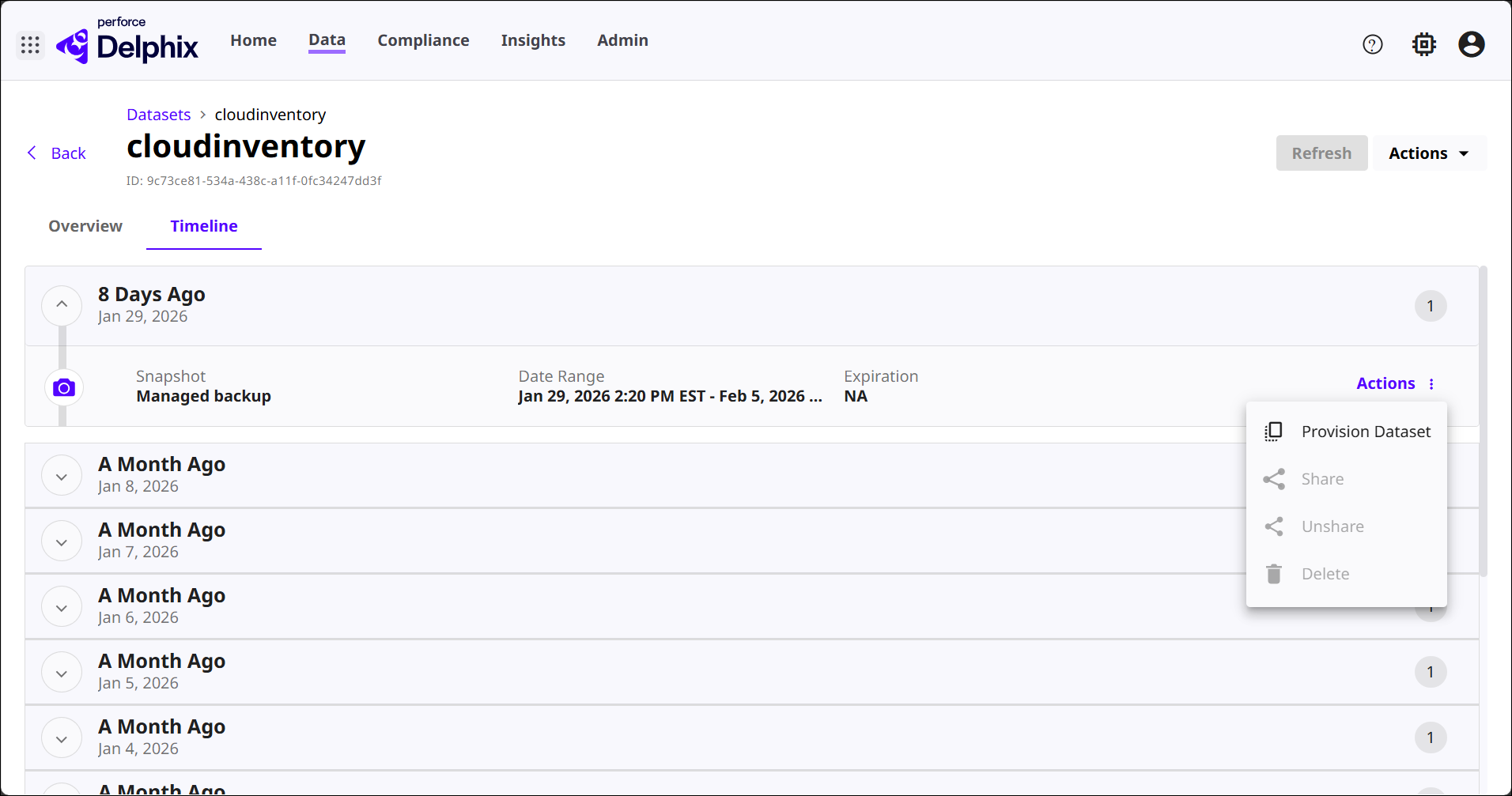 Reprovision Dataset: Allows you to recreate a dataset that was previously provisioned, often used when refreshing environments or resetting data for testing workflows. This action may be disabled if the dataset has never been provisioned.