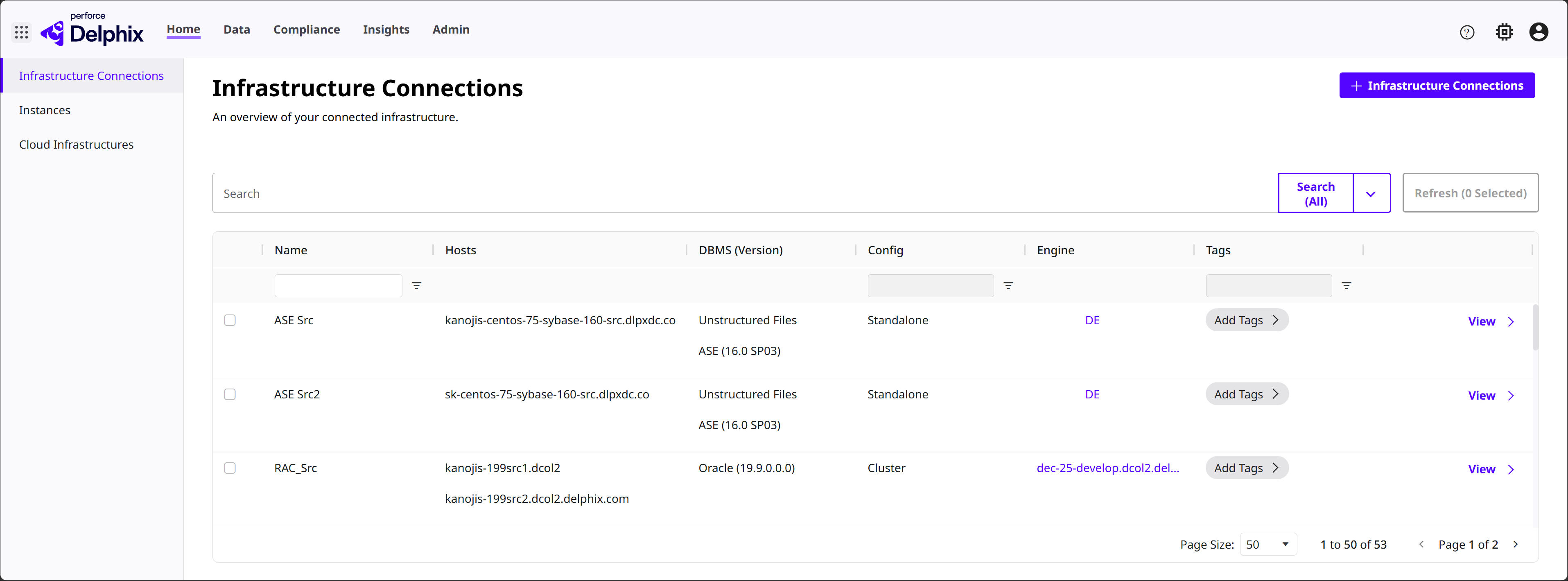In the Infrastructure Connections page list, columns show the Name, Hosts, Database Management System and Version (DBMS), Config, Engine, and Tags of each DCT-connected infrastructure.