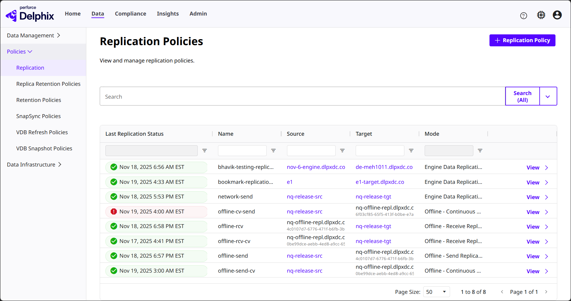 Replication Policies define how Data Control Tower (DCT) replicates data between Delphix Engines. They are used to configure engine-to-engine replication for migration, disaster recovery, Continuous Vault, and offline (air-gapped) workflows.