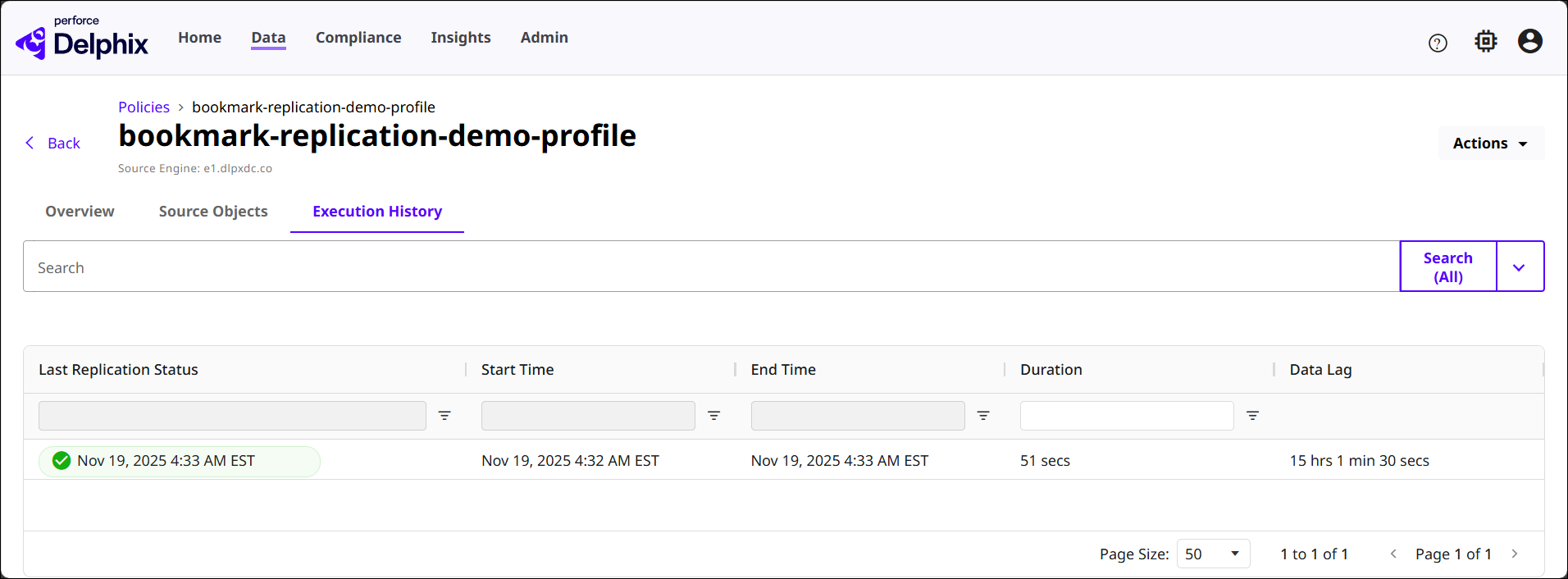 Execution History: Lists previous runs of the policy with details like last replication status, start and end time, duration, and data lag.