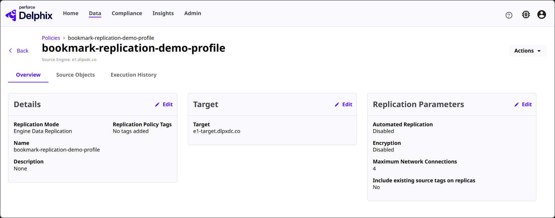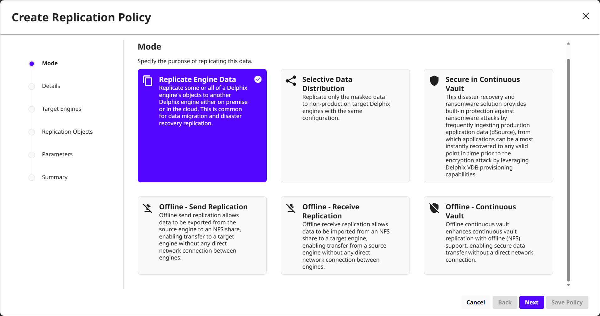 Replicate Engine Data: Replicate some or all objects from a Delphix Engine to another engine on premises or in the cloud. This mode is typically used for data migration and disaster recovery.
