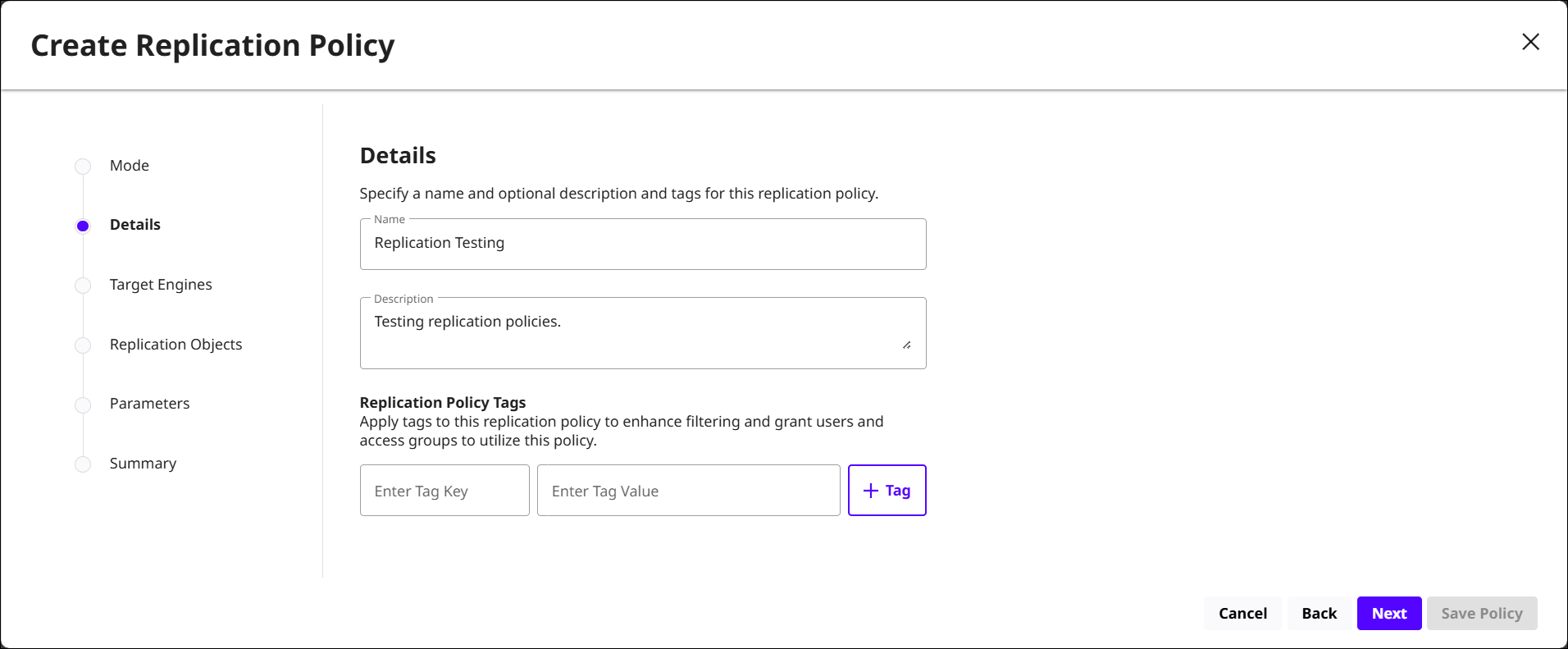 Details: Specify metadata for the replication policy by providing a name, description, and relevant tags.