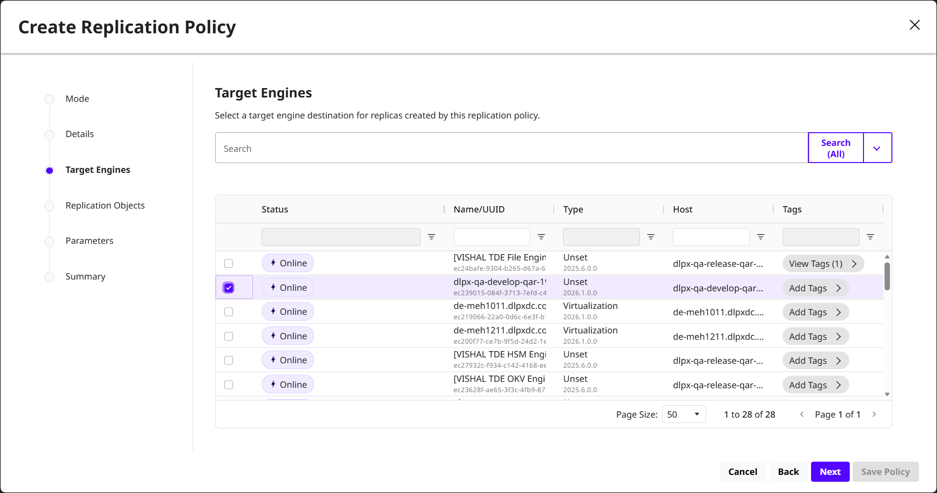 Target Engines: Choose a DCT-connected Delphix Engine to receive replicas created by this policy. For offline modes, target selection may be limited to engines that participate in the offline workflow.