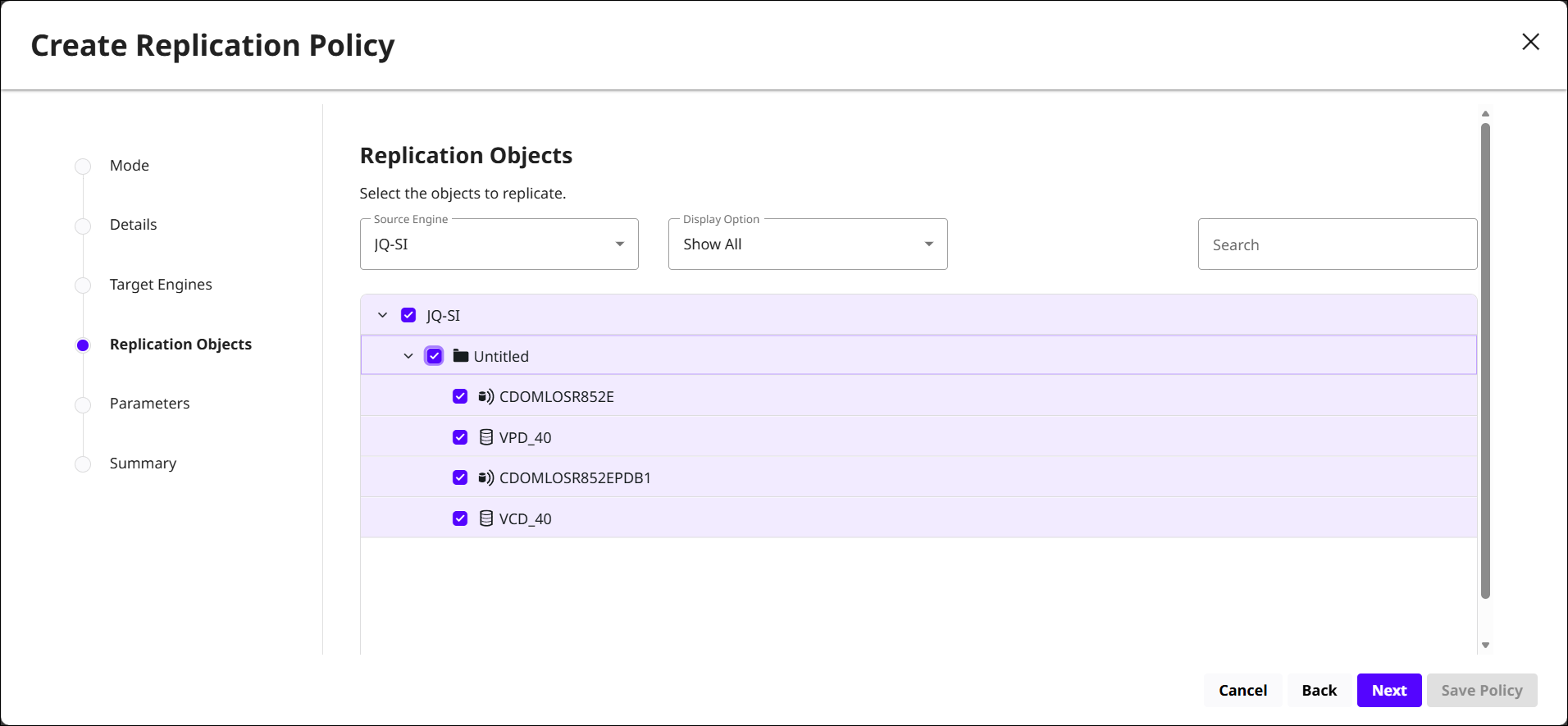 Replication Objects: Choose the objects this policy will replicate. You can expand folders or groups to view databases, dSources, VDBs, or other supported objects.